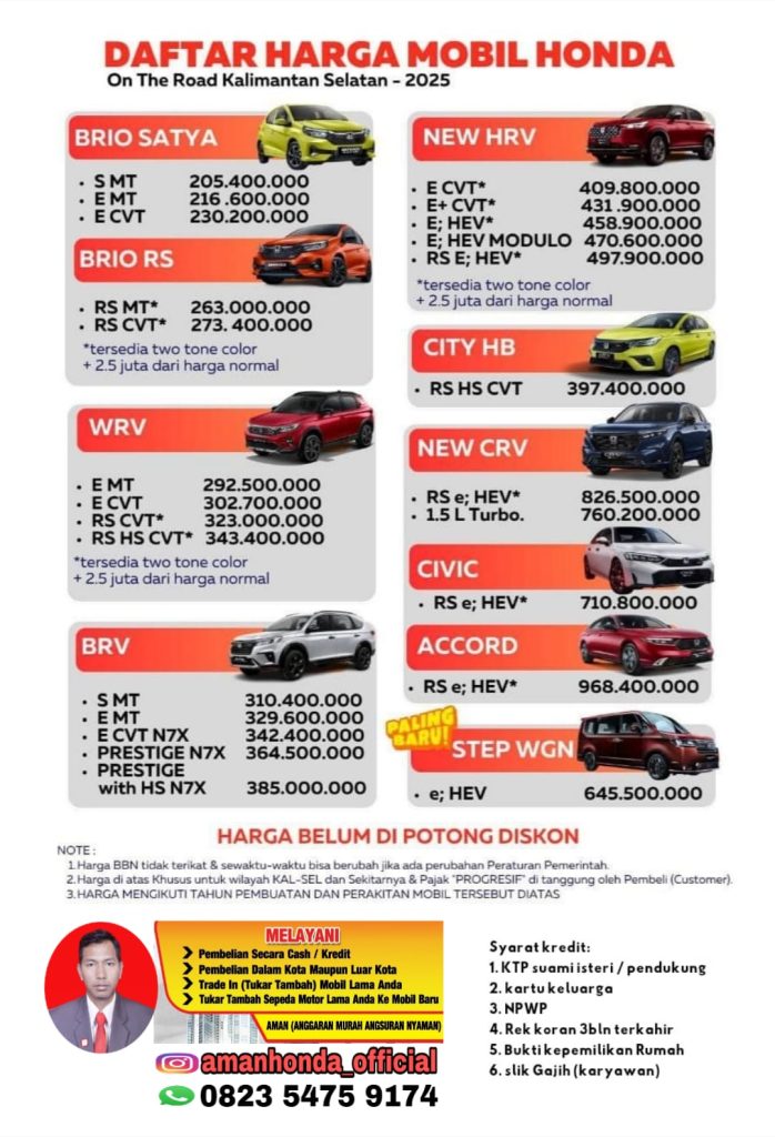 Daftar Harga terlengkap Honda Banjarbaru hanya ada di Honda Banjarbaru Kalimantan Selatan. Dapatkan Harga Dan promo terbaik pembelian mobil Honda se Banjarbaru.