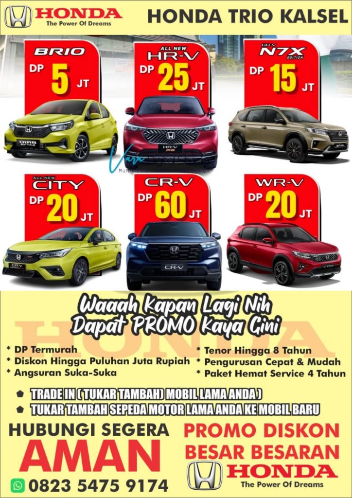 Percayakan pembelian mobil Honda Anda di Promo Honda Banjarbaru dan dapatkan harga, promo, dan pelayanan terbaik. DP Murah / Cicilan Ringan / Promo menarik semua ada hanya di Honda Banjarbaru.